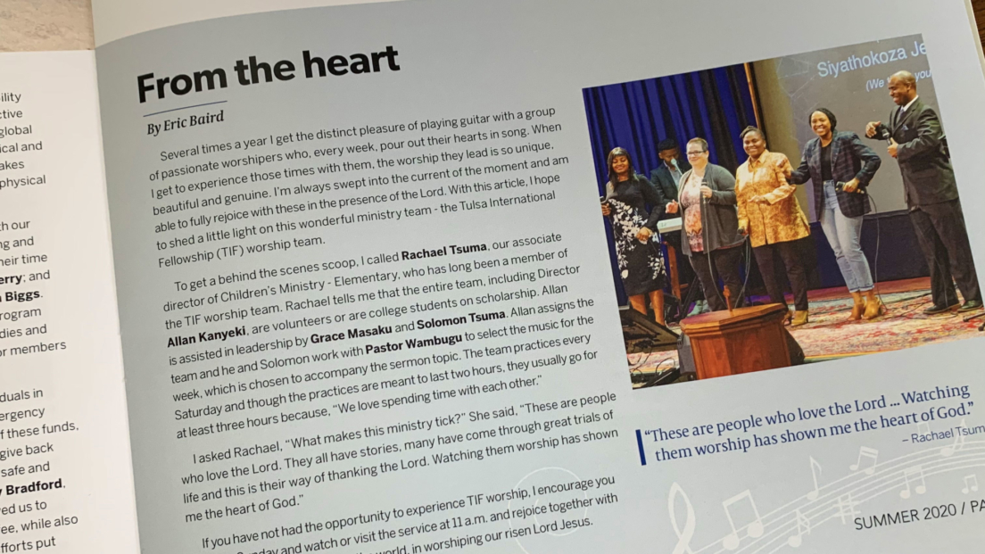 Several times a year I get the distinct pleasure of playing guitar with a group of passionate worshipers who, every week, pour out their hearts in song. When I get to experience those times with them, the worship they lead is so unique, beautiful and genuine. I’m always swept into the current of the moment and am able to fully rejoice with these in the presence of the Lord. With this article, I hope to shed a little light on this wonderful ministry team - the Tulsa International Fellowship (TIF) worship team.