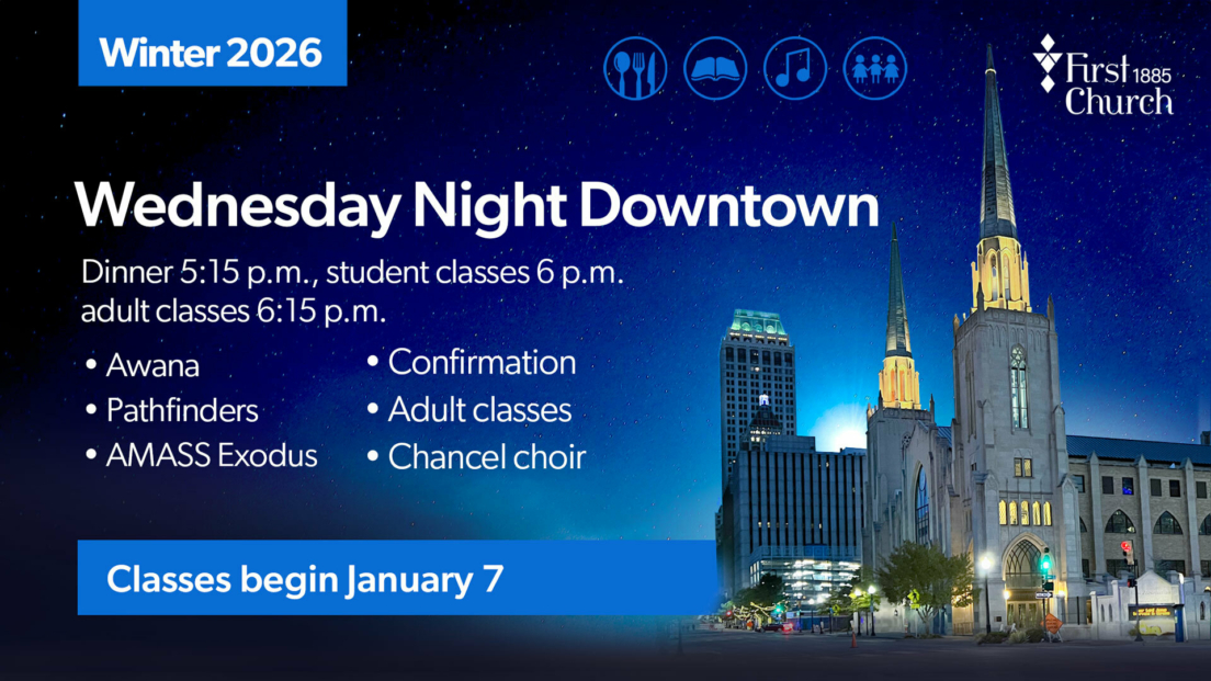 Wednesday Night Downtown is our midweek programming that offers many ways to connect through fellowship, education, fun and activities for the whole family. Join us each Wednesday downtown at First Church Tulsa!